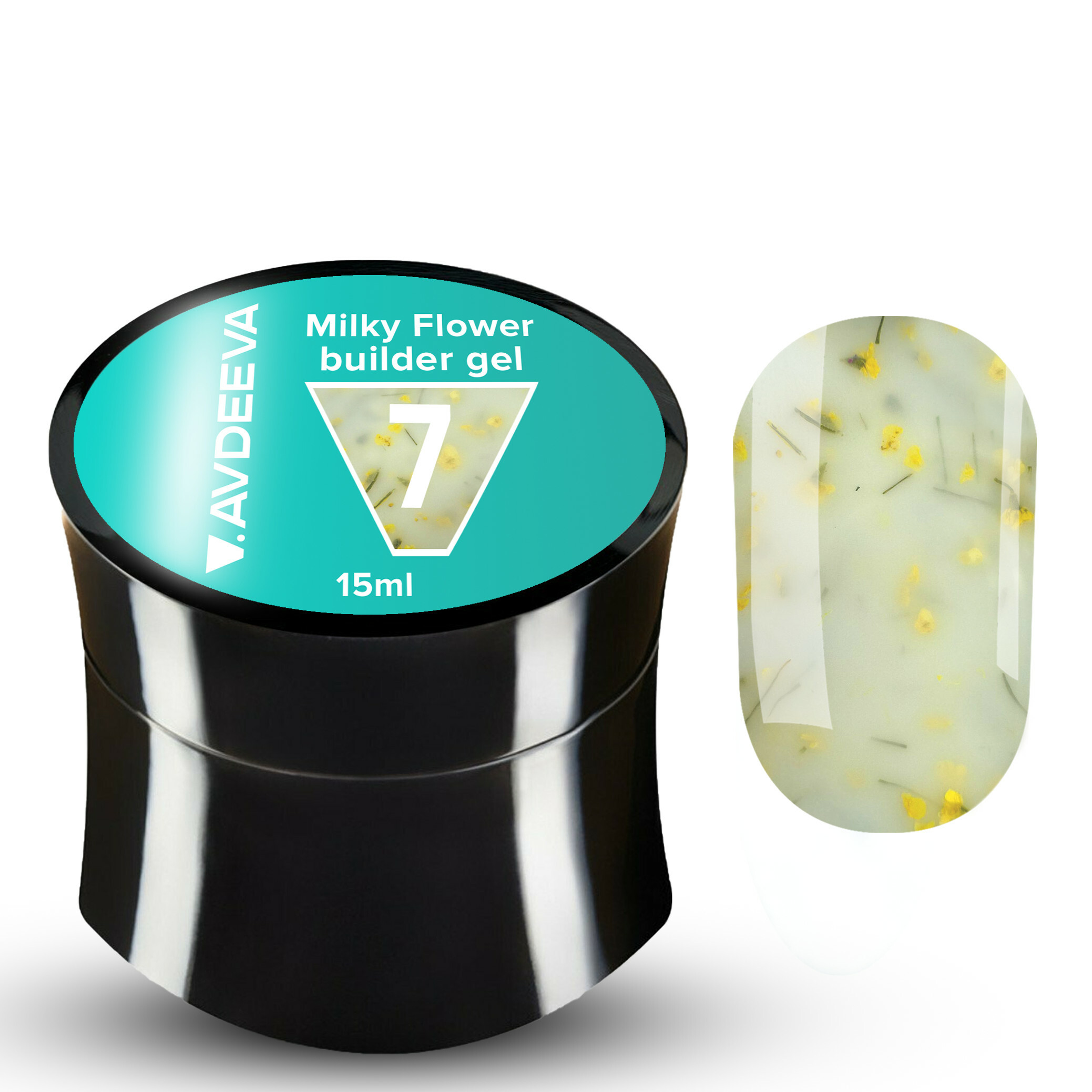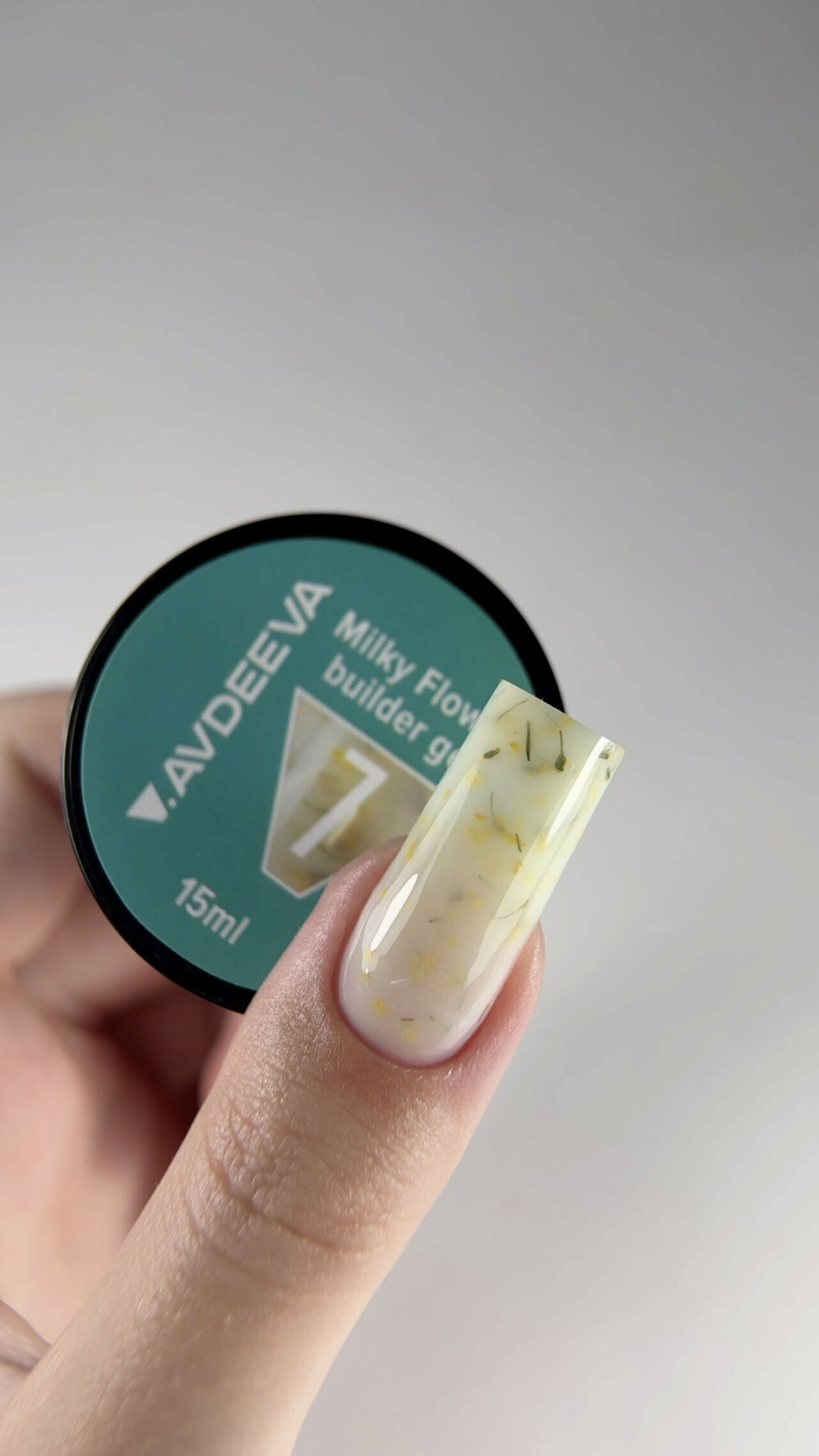AVDEEVA Milky Flower Builder Gel Nr. 7 – Milchiges Modelliergel mit gelben Trockenblumen, 15 ml