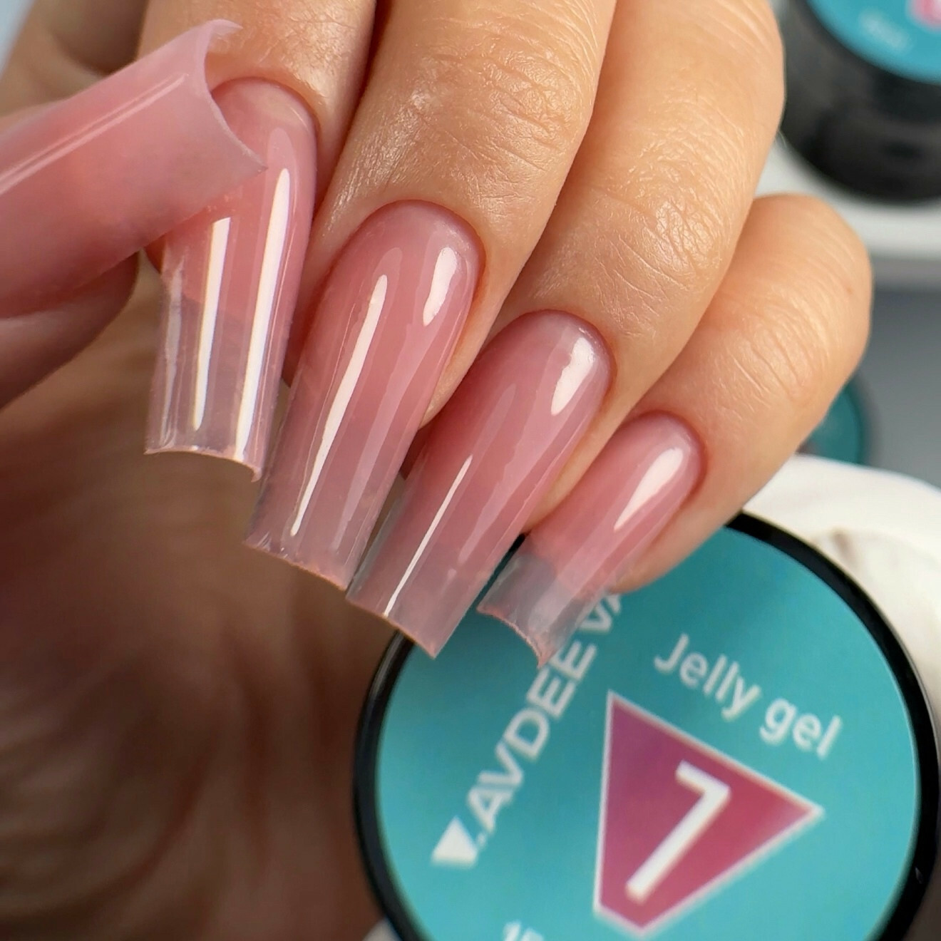 Jelly Gel Victoria Avdeeva Nr. 7 ist ein dickviskoses Aufbaugel mit stabiler, gelartiger Konsistenz und einem edlen Puderrosa-Ton.