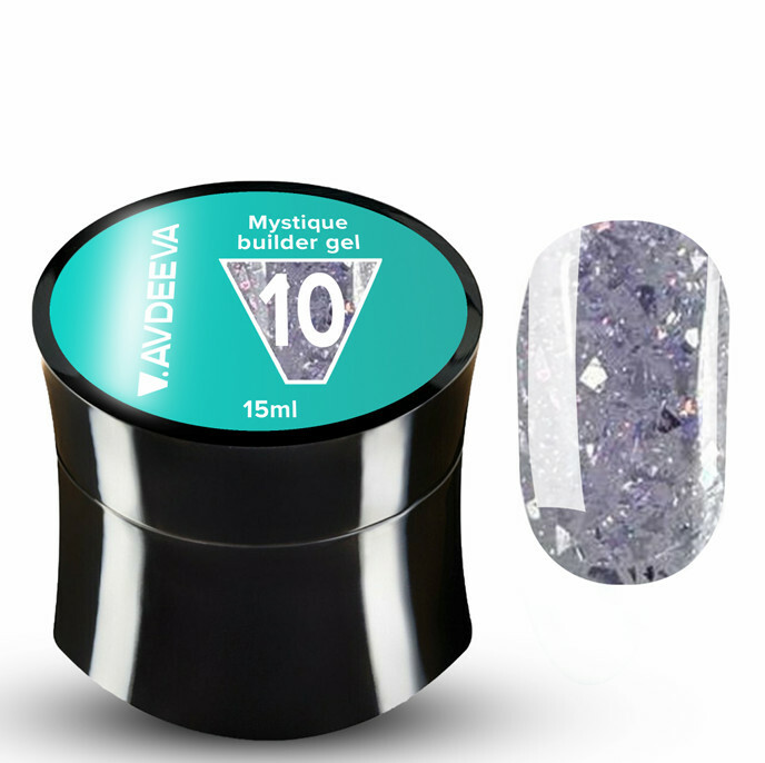 Modelliergel AVDEEVA Mystique Builder Gel Nr. 10 – ein transluzentes, eisig-fliederfarbenes Gel mit schimmernden Blattmetall-Flakes.