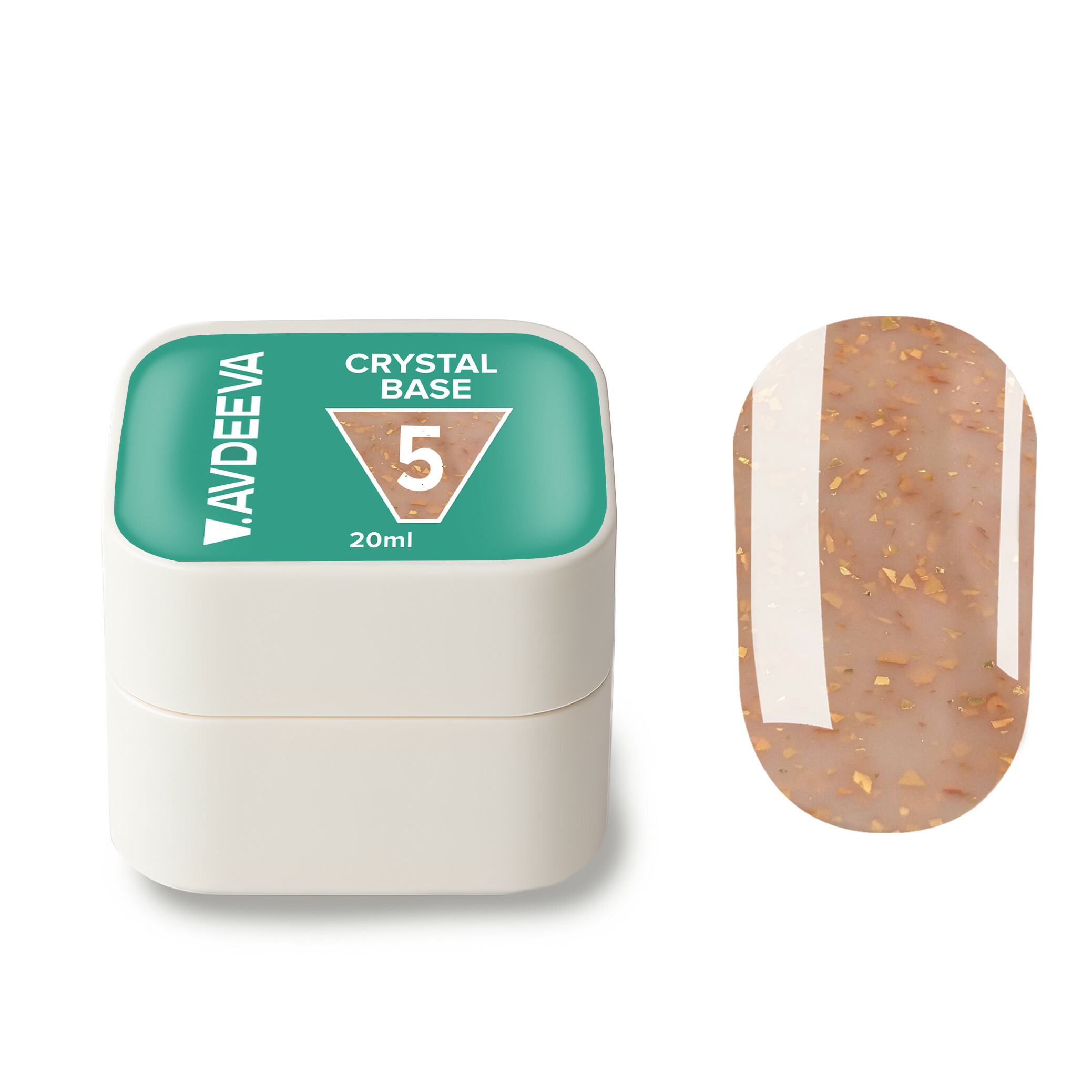 Crystal Base Nr. 5 von Victoria Avdeeva. Milchig-pfirsichfarbene Base mit goldener Blattfolie für eine zarte und stilvolle Maniküre. Inhalt: 20 ml.
