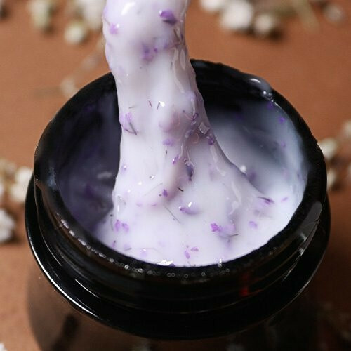 Milky camouflage gel with real purple dried flowers. Medium viscosity, ideal for strengthening, sculpting, and floral nail design.