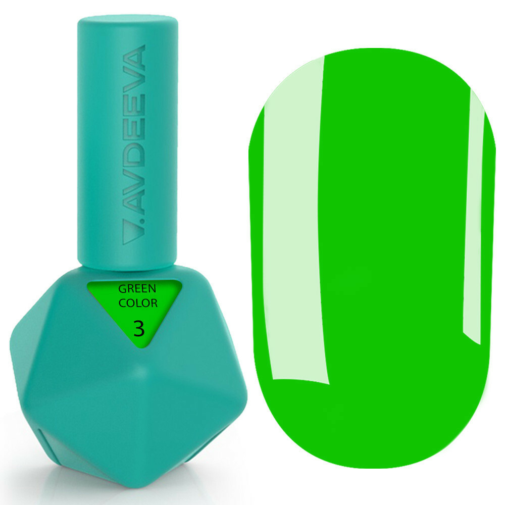 Victoria Avdeeva GREEN COLOR 3 is a vivid neon green gel polish that instantly catches the eye. The rich formula offers full coverage with a smooth, even finish. Perfect for bold summer designs and accent nails. Works with any base and top coat.